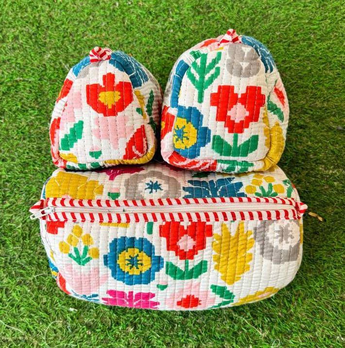 These cosmetic bags are perfect for travel and organization. Featuring a hand-printed block print set against quilted stitching, these eye-catching bags are great for those on-the-go! Grab one or purchase the whole trio!