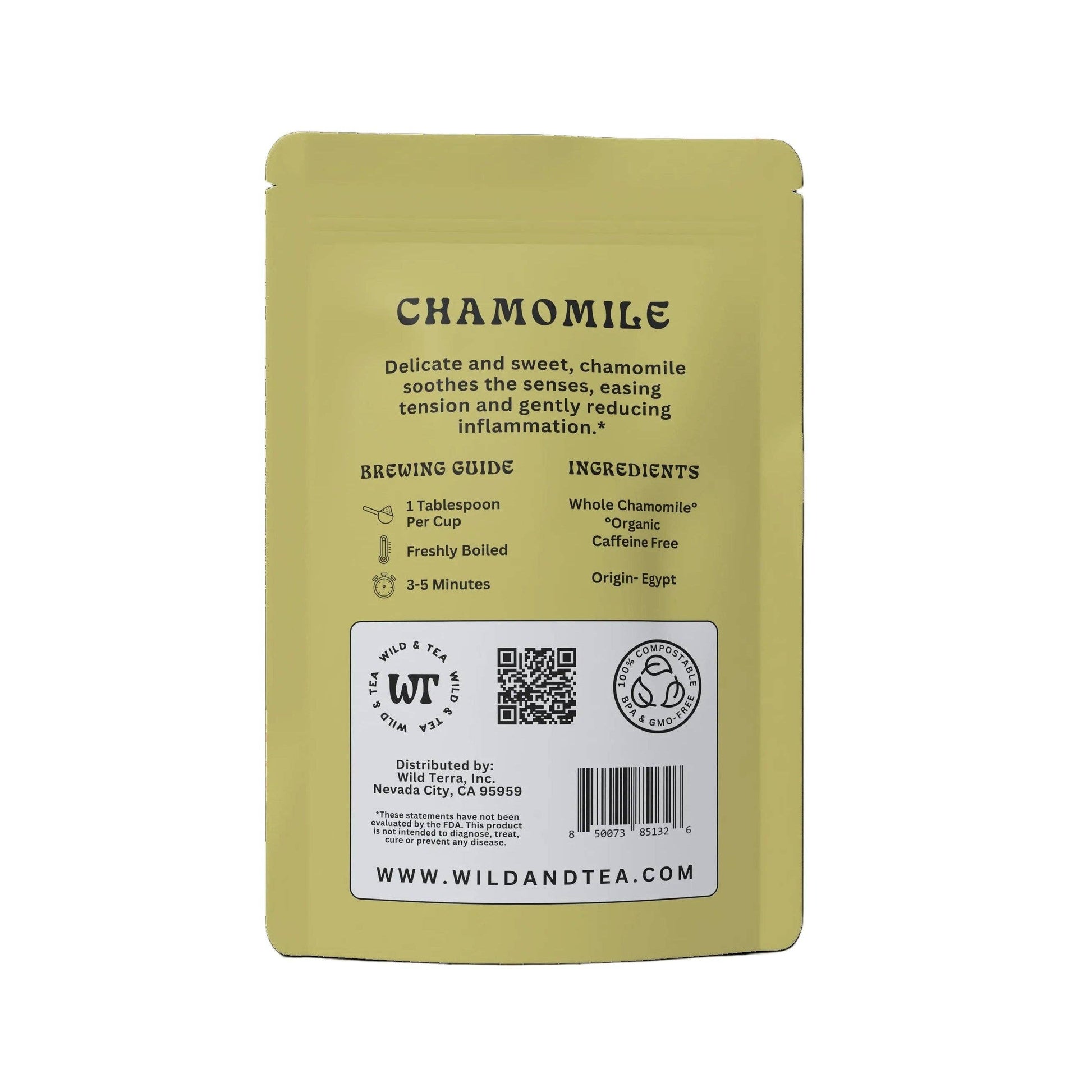 Delicate and sweet, chamomile soothes the senses, easing tension and gently reducing inflammation.* Add 1 tablespoon per cup of freshly boiled water and steep 3- 5 minutes Loose Leaf | Caffeine Free Ingredients- Organic Chamomile Flower Origin- Egypt 100% Compostable BPA & GMO-Free Packaging.