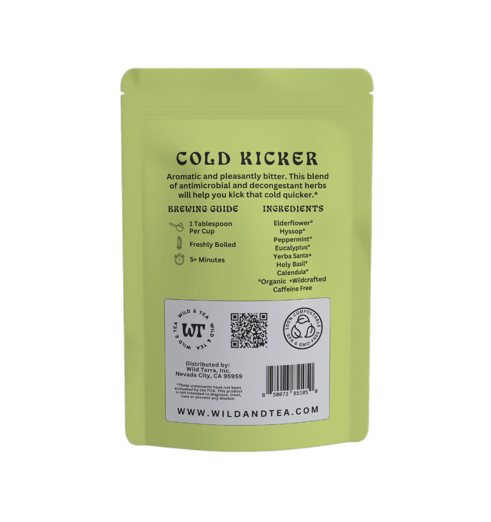 Aromatic and pleasantly bitter, this blend of antimicrobial and decongestant herbs will help you kick that cold quicker. * Ingredients- Organic elderflower, organic hyssop, organic peppermint, organic eucalyptus, wildcrafted yerba santa, organic holy basil and organic calendula. Caffeine free Brew- 1 tablespoon per 10 ounces of freshly boiled water. Steep for 5 or more minutes. Loose leaf Approximately 10 cups of tea per oz 100% Compostable BPA & GMO-Free Packaging.