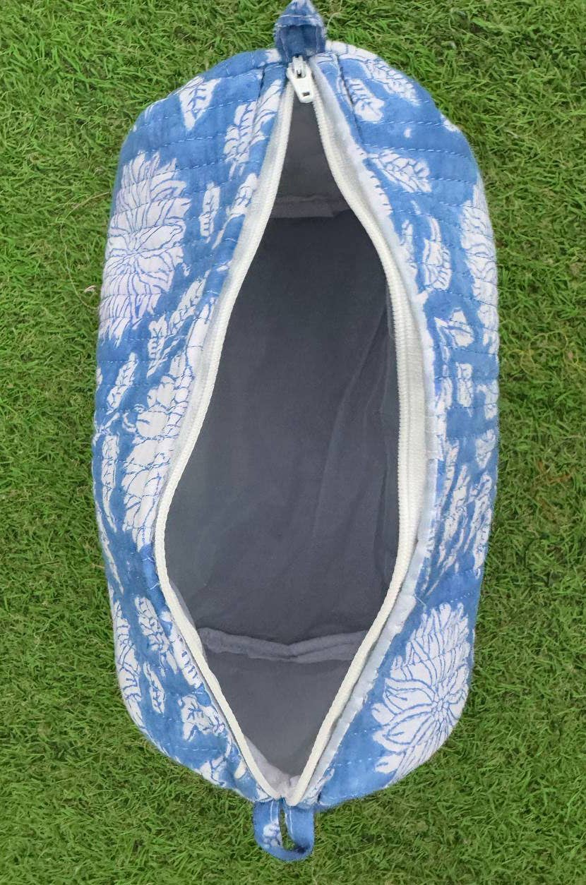 These toiletry bags are perfect for travel and organization. Featuring a hand-printed block print set against quilted stitching, these adorable bags are eye-catching and perfect for any on-the-go lifestyle.
