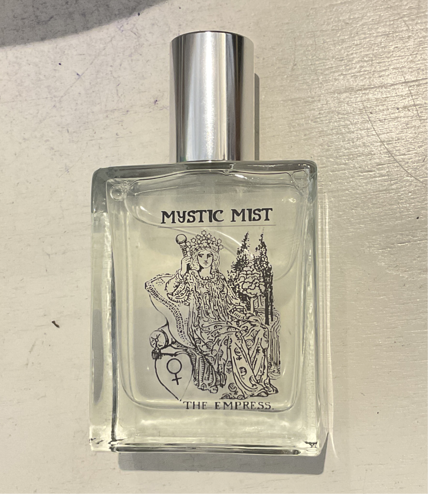 Embrace the powerful energy Empress Tarot Card with The Empress Mystic Mist. This all-purpose mist, scented with Whiskey, Pepper, Lavender, Cedar, Sandalwood, Basalm Amber, and Musk. It will infuse your hair, body, and surroundings with harmony and abundance.